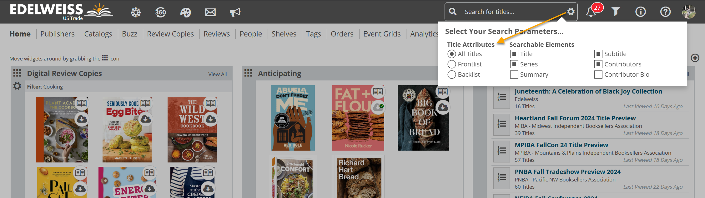 The search bar in Edelweiss is where you can search for All, Frontlist, or Backlist titles. Hover over the search bar at the top-right of your screen and click the gear icon that appears to edit your search parameters any time: