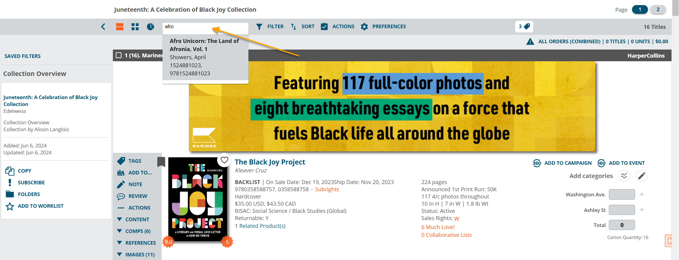 From within a title list (a catalog, a collection, list of review copies, an order, Buzz, etc.) you’ll see a Type here to find… box. This tool allows you to quickly jump to a specific title in that list. Start typing and you’ll see all the titles in that list that contain that specific combination of letters. Click to jump right to that title.
