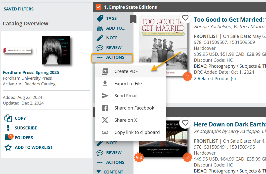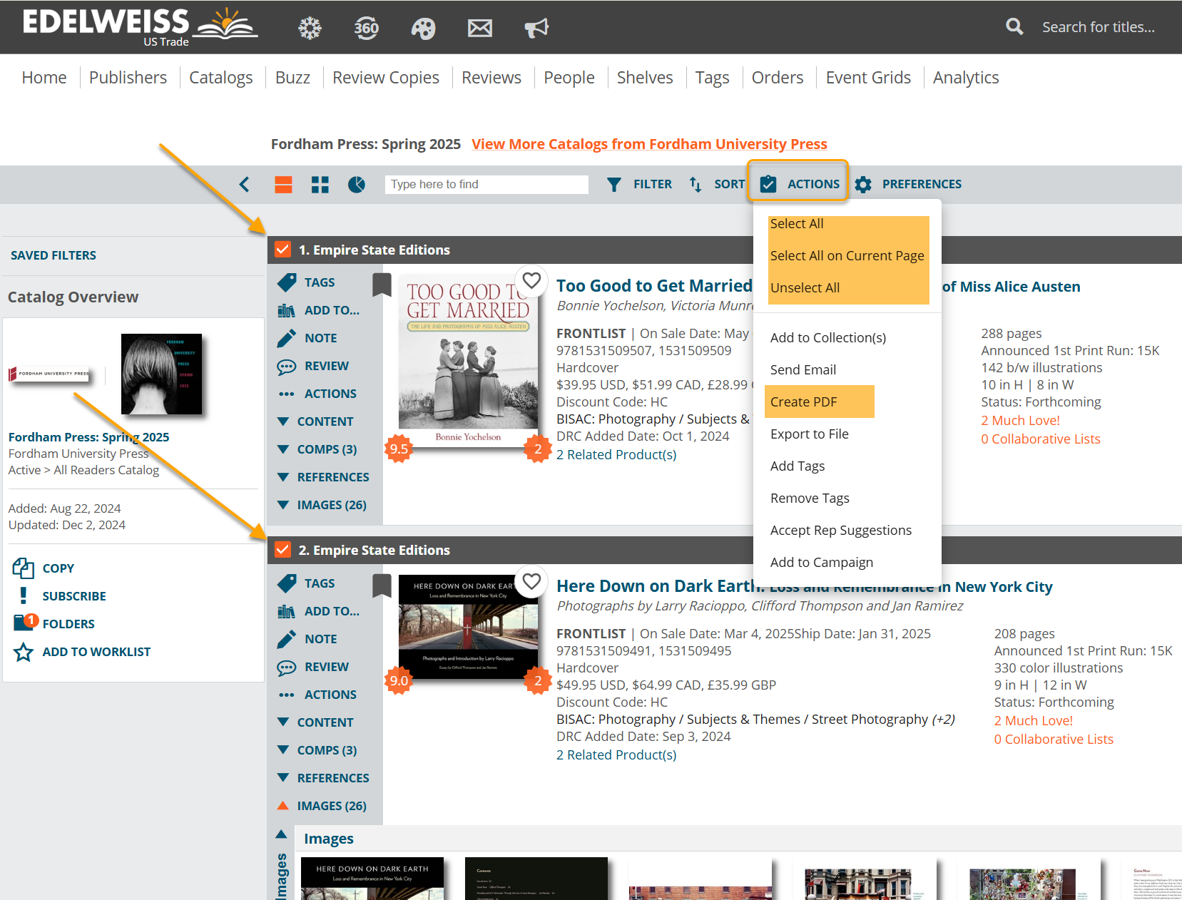 Or, if you would like to print an entire catalog, you can click on Select All (or Select All on Current Page, as desired) in your Actions, as shown above. Titles can be un-selected by clicking on the checkmark again in the title view or all can be un-selected by clicking on Unselect All in Actions. Once you have selected all of the titles you would like included in the PDF that you are creating, just click on Actions from the menu on top, and select Create PDF.