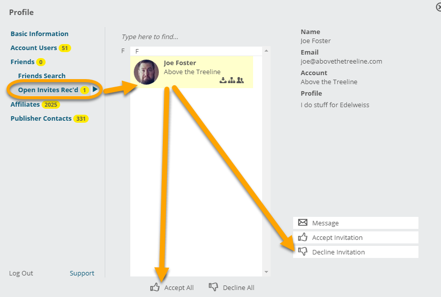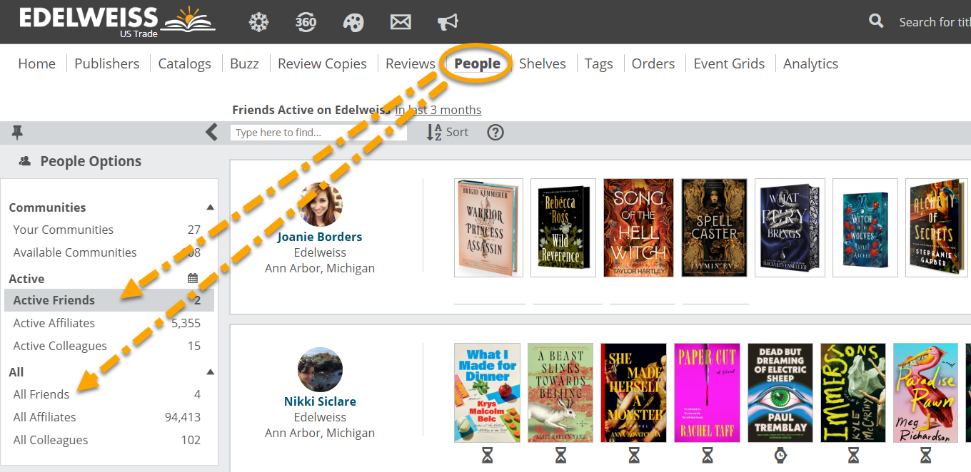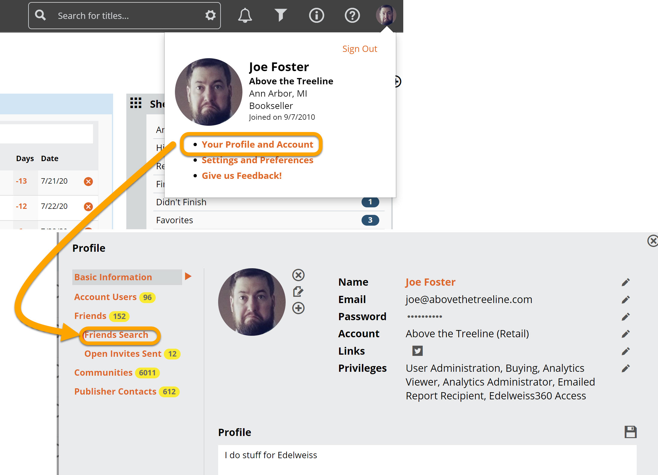 The simplest way to find people in Edelweiss is to search for them while viewing your profile, which you can reach by simply clicking on your name at the top of any Edelweiss screen.