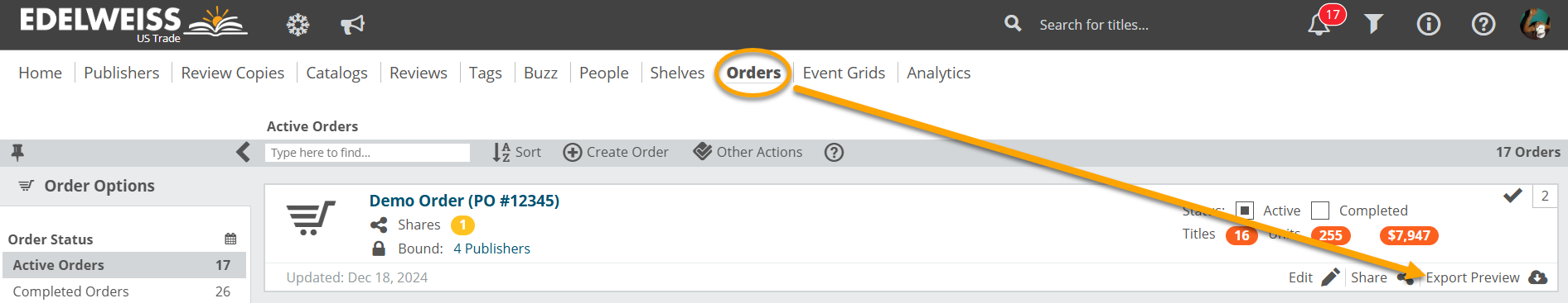 To export an order, open the Export Preview screen for the relevant order, found on your Orders page. You can either click the export icon…: