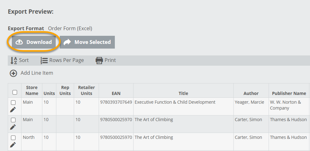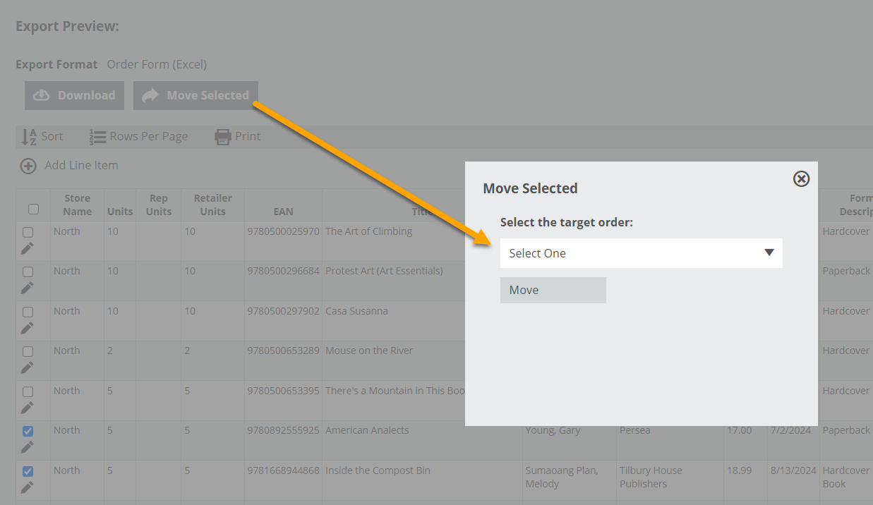 Move Selected allows you to move titles from one order to another, which can be very useful if you accidentally add titles to the wrong order. You can only move titles to other Active Orders.