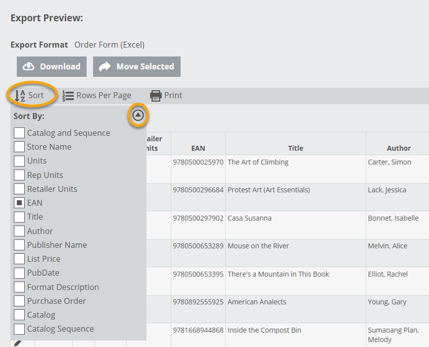 You can sort an order by any of the available data columns, which vary depending on which format you’re using. Use the arrow icon to switch between ascending and descending order.