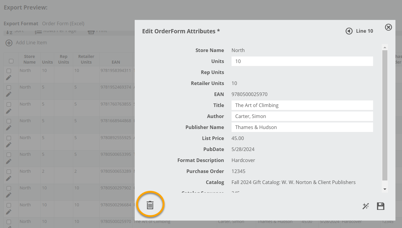 Delete a title from an order with the trash can icon.