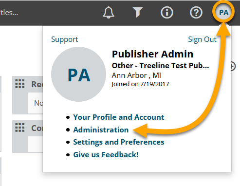 Rather than accessing the page via link, you can also click on your profile picture or initials at the top of any Edelweiss page and select Administration.