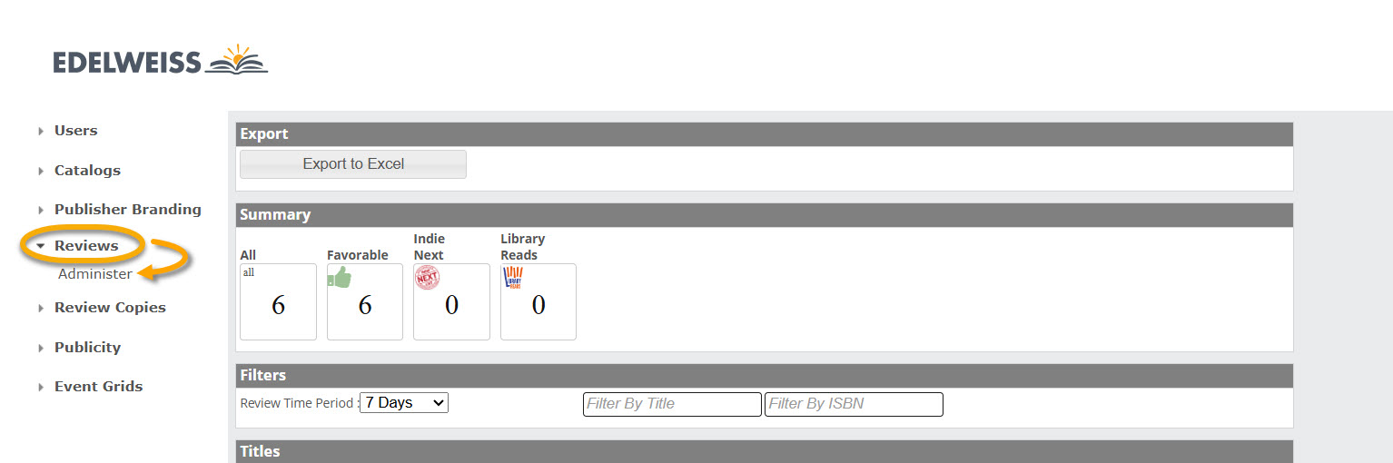 If your Edelweiss account has been granted the “Review Admin” privilege, you can easily manage and feature reviews of your titles on your Administration Page.