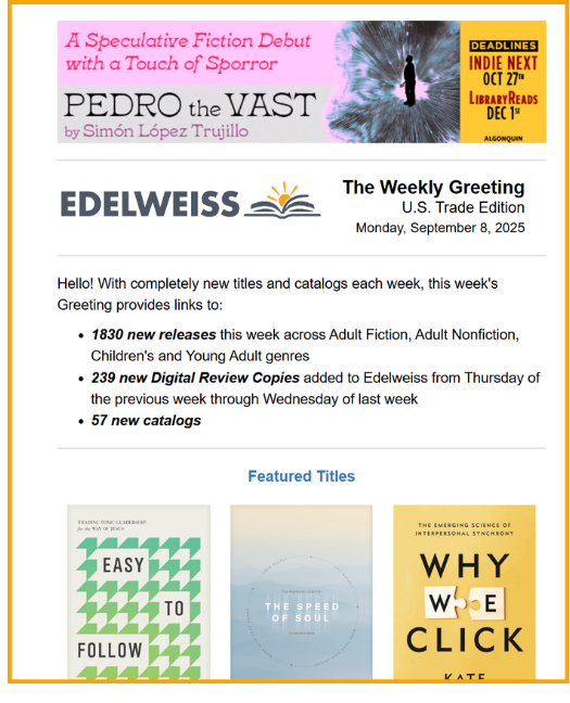 The Weekly Greeting newsletter is sent every Monday morning to 100,000+ book professionals in the U.S. trade market and 3,300+ in the U.K. trade market. Each issue highlights all new review copies and catalogs added to Edelweiss in the past week. Both editions maintain an average open rate of 30%. If you don’t already receive the newsletter, you can subscribe here.