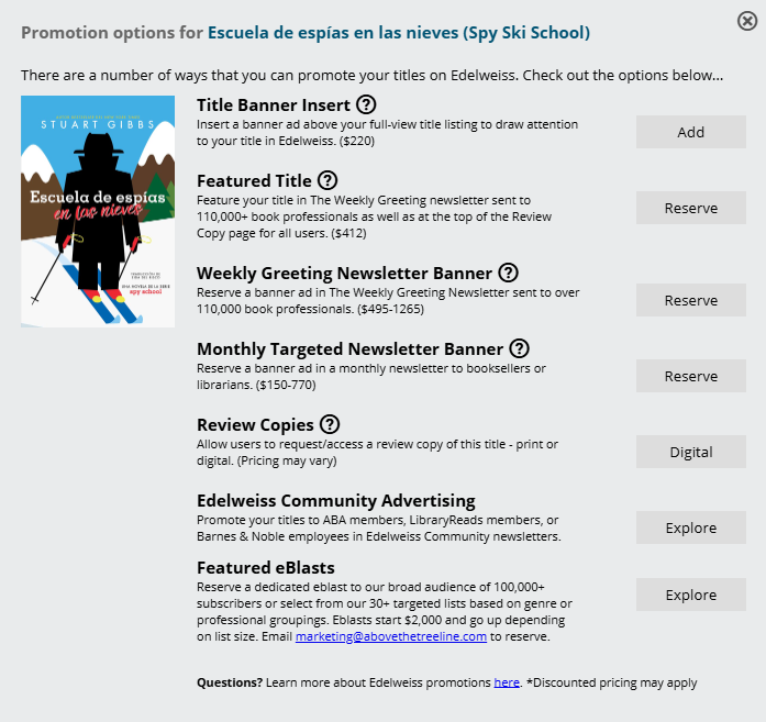 - Featured Titles– Highlighted at the top of the Weekly Greeting newsletter AND at the top of the Review Copies tab in Edelweiss during the reserved week.